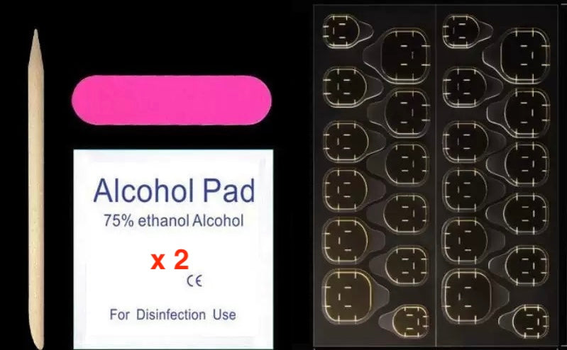 14 piezas en diferentes tamaños. Adhesivos incluidos(pegatina jelly, palito de naranjo,2 alcohol pads,Mini lima de uñas
